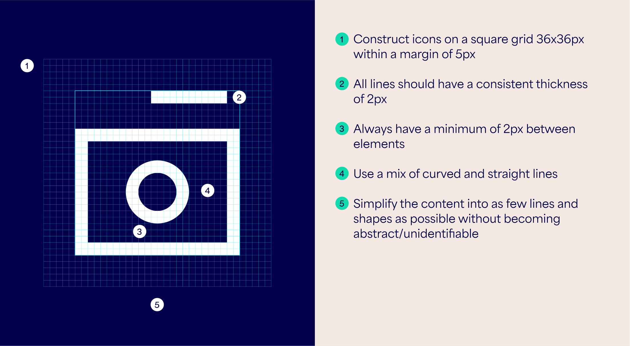 To maintain consistency when creating new icons, use the following guidance for icon construction and style.