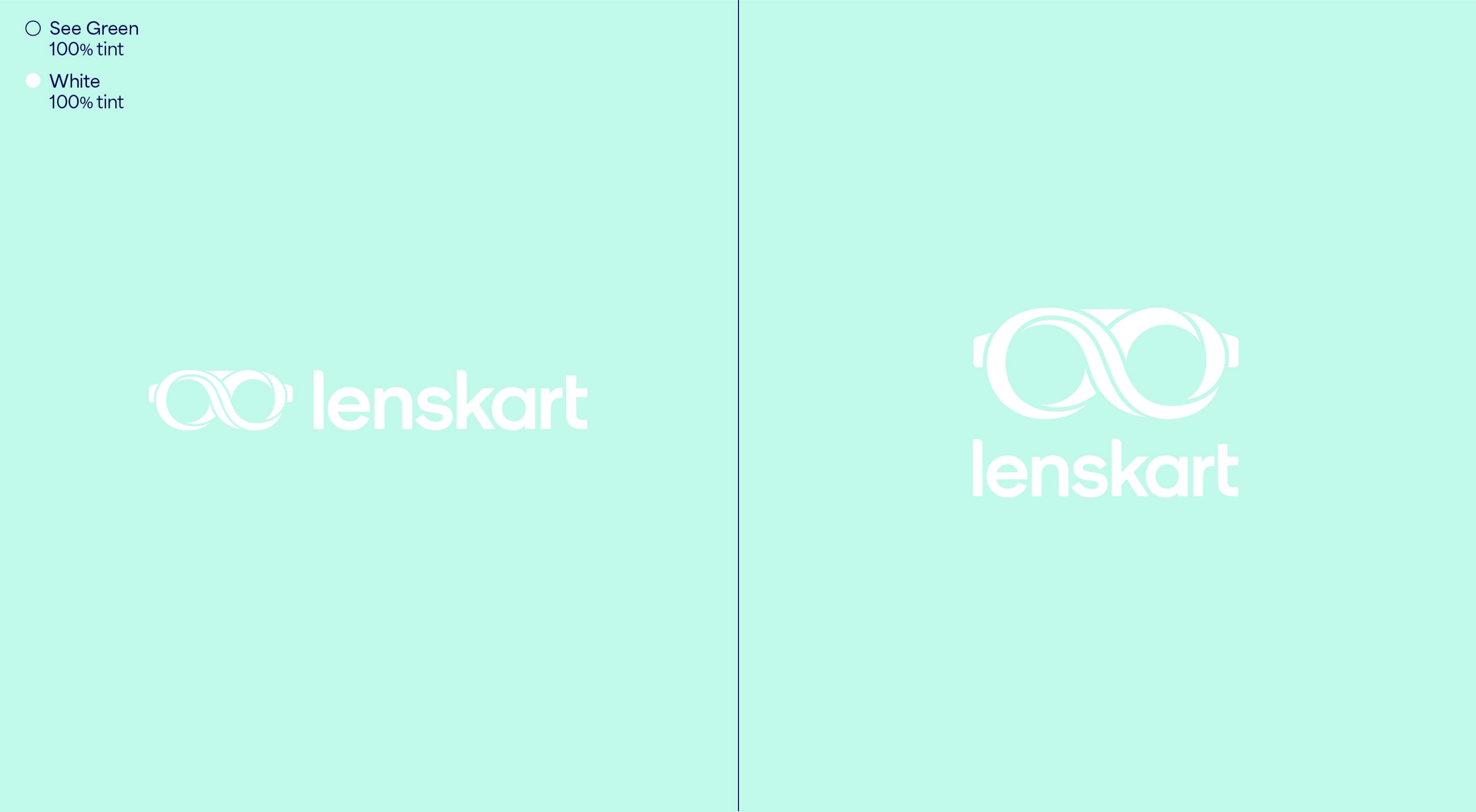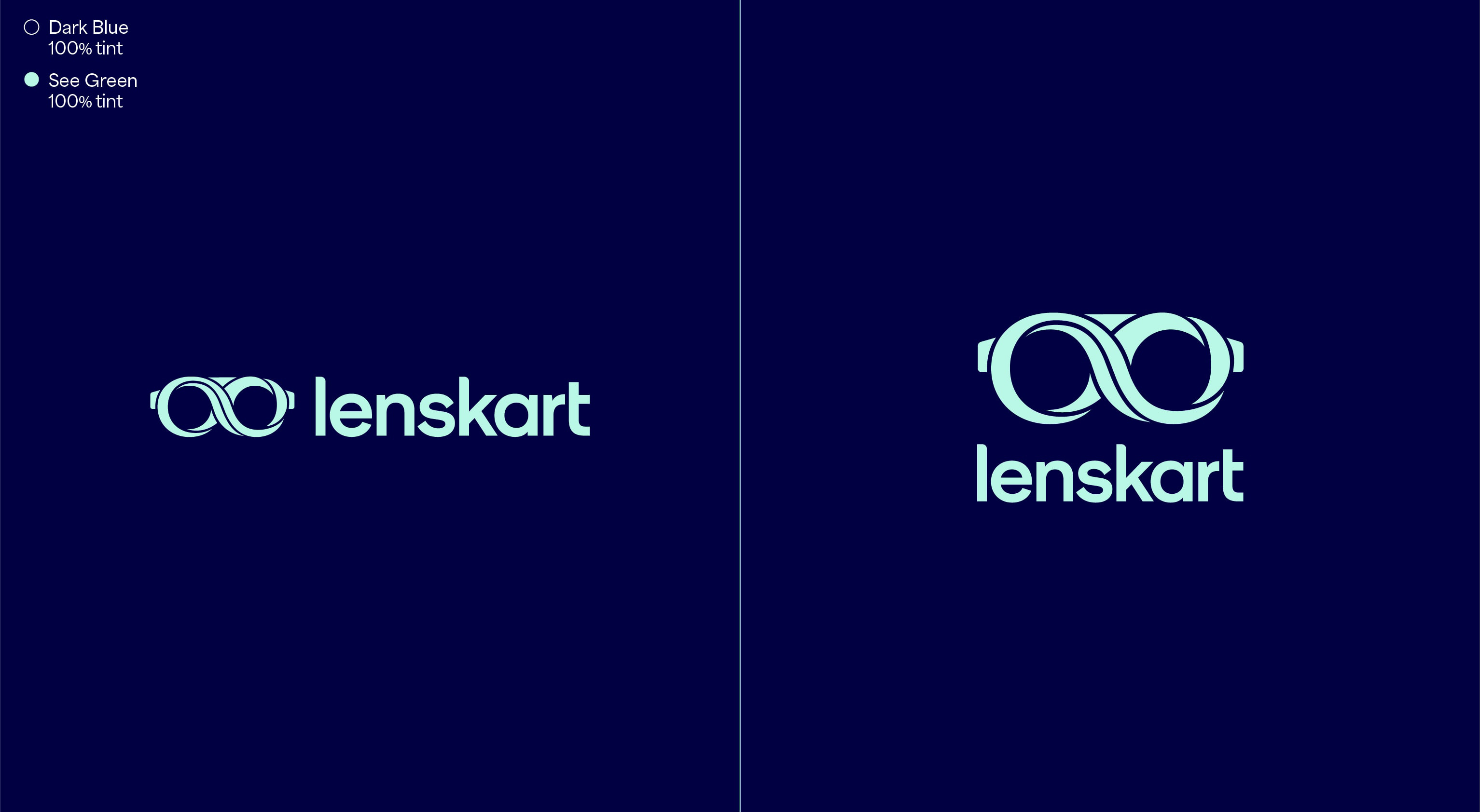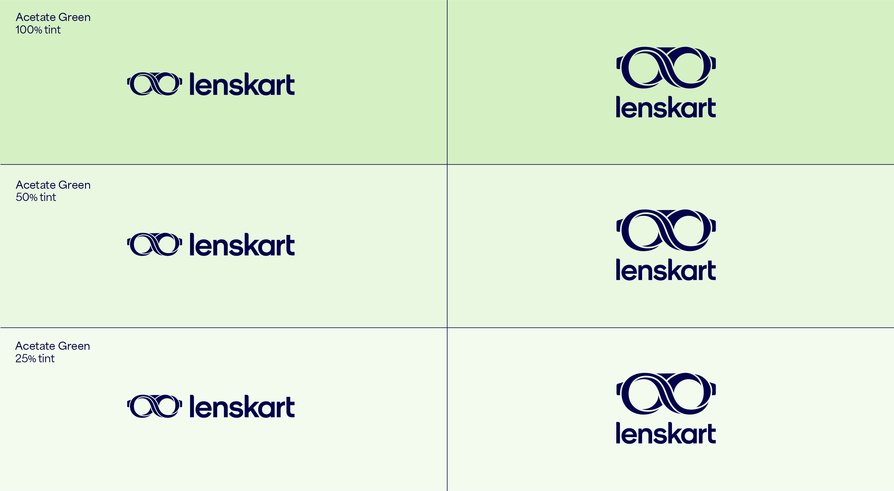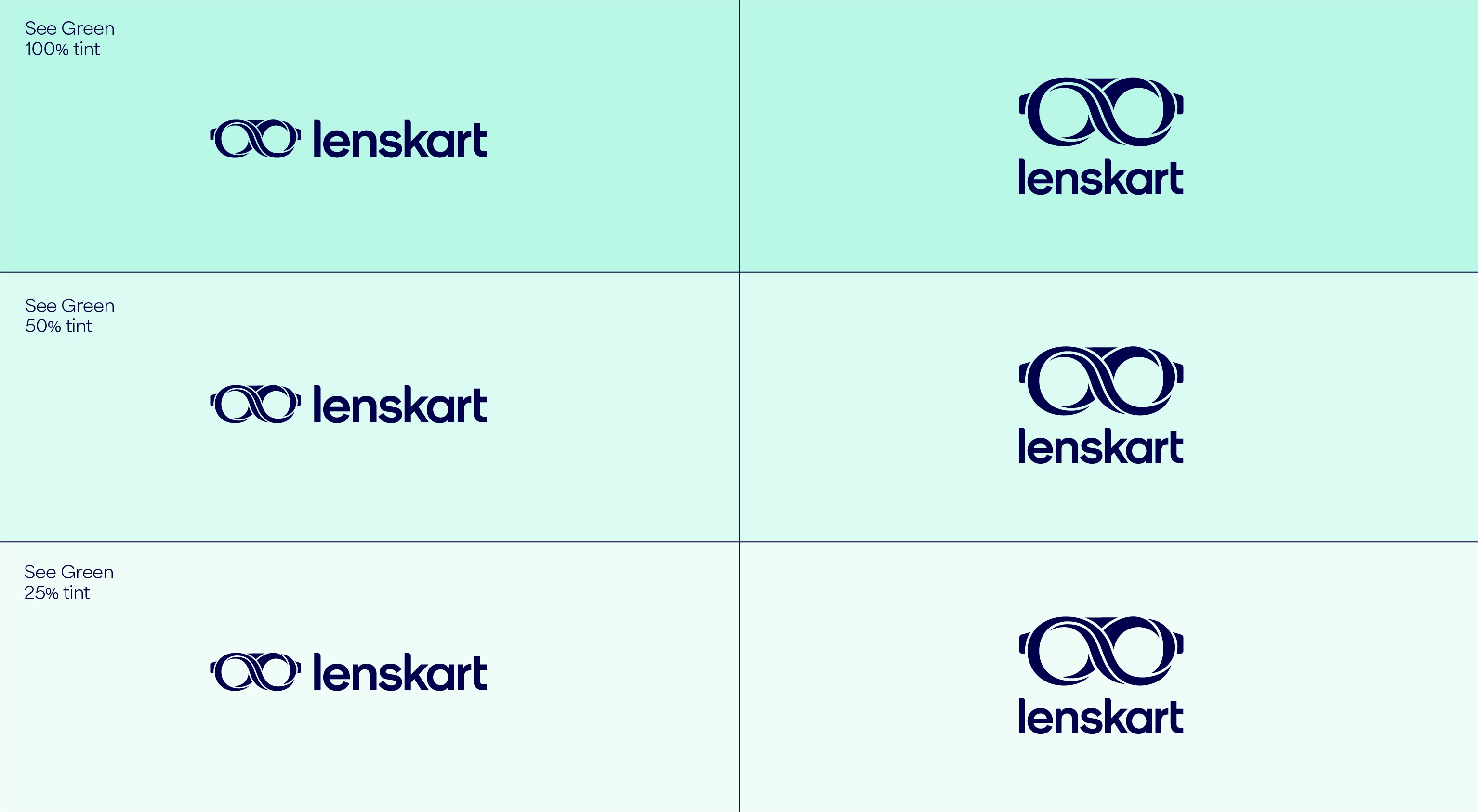 Our leading background colour is See Green in both 100%, 50% and 25%, and Dark Blue is used for our primary lockups. These colours are used to bring awareness to the brand, so a customer’s first interaction of Lenskart should be with these colours. That means we lead with See Green and Dark Blue on applications such as billboards, outer store signage, the loading screen for the app, and the landing of our website. The other background colours are used with the Dark Blue logo further into the experience once the customer has had that first interaction of the brand with the See Green.
