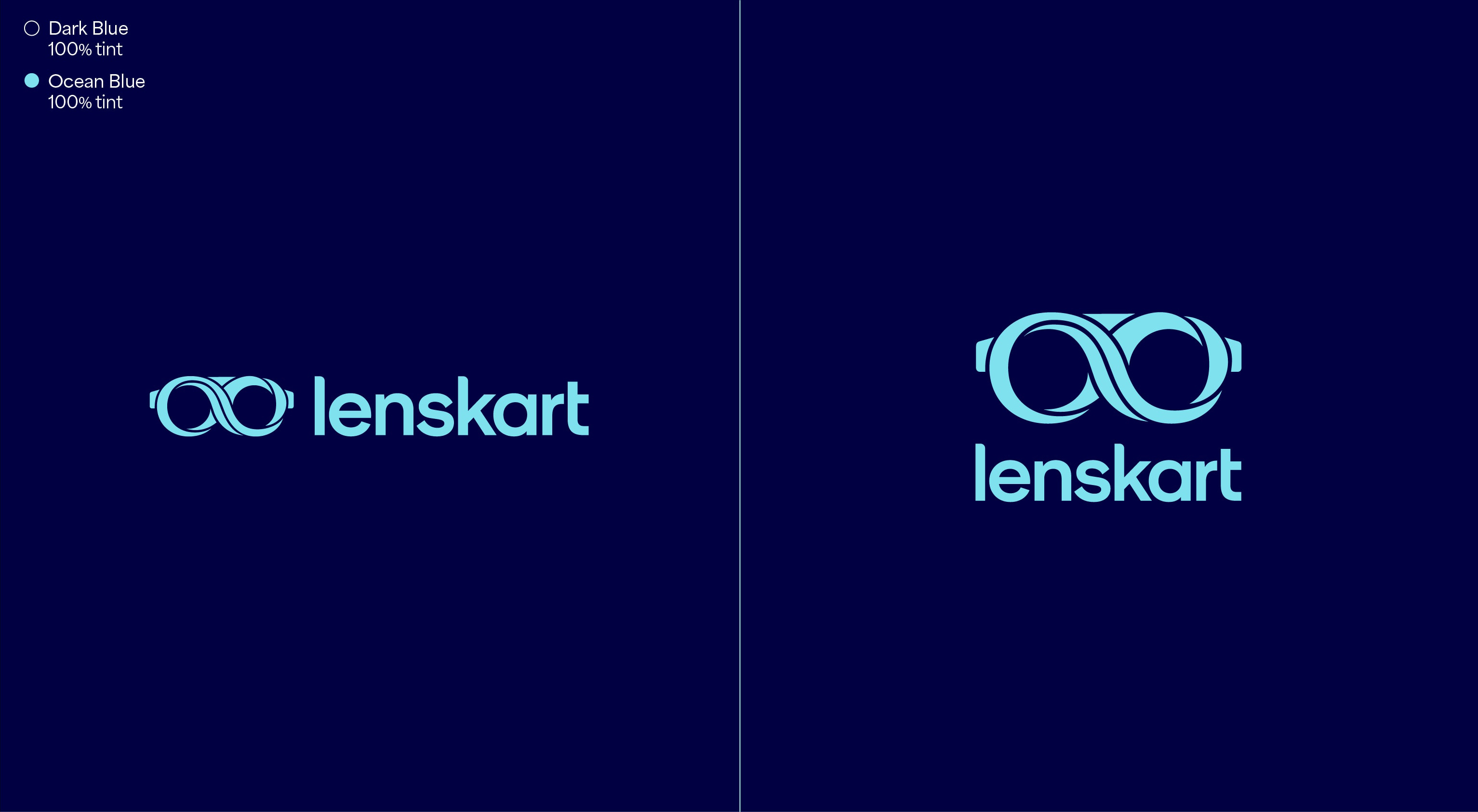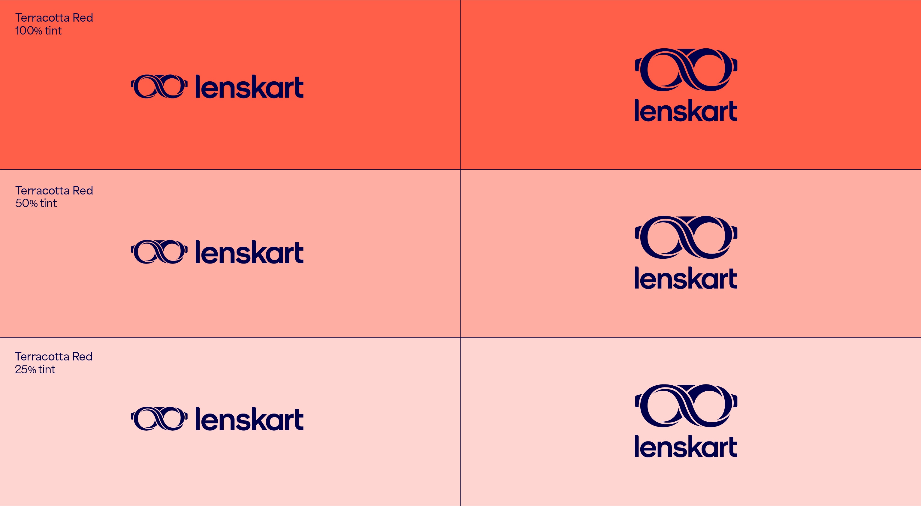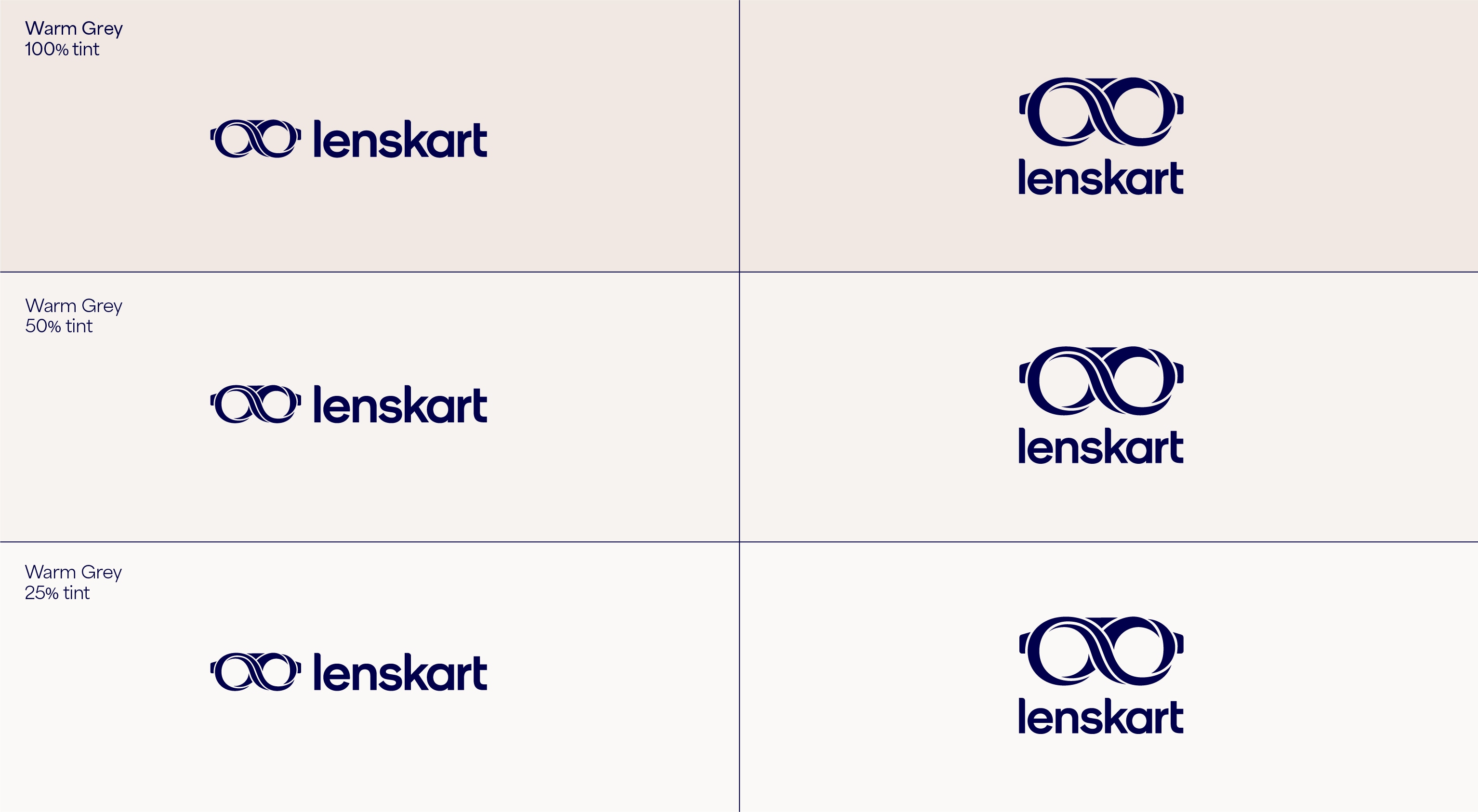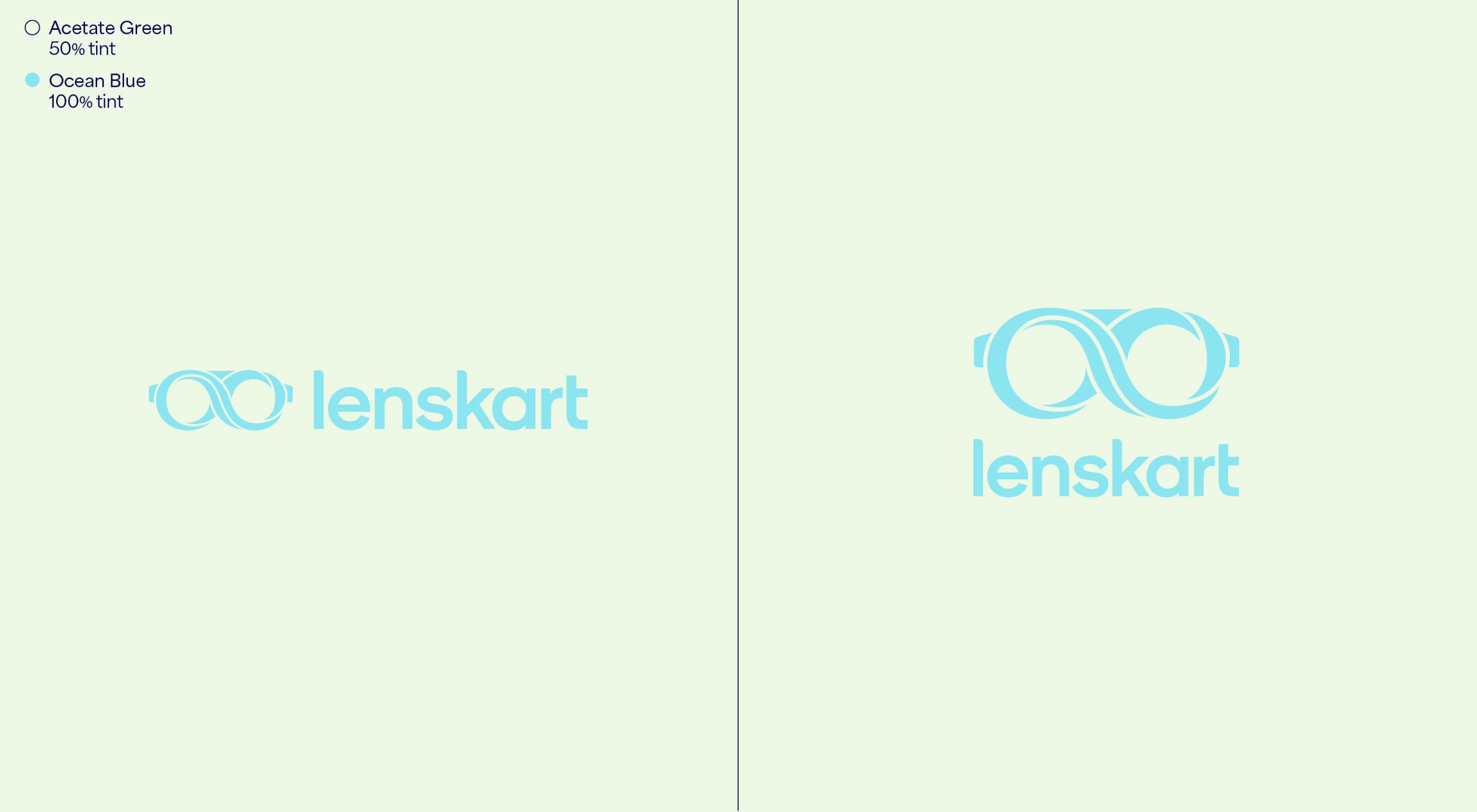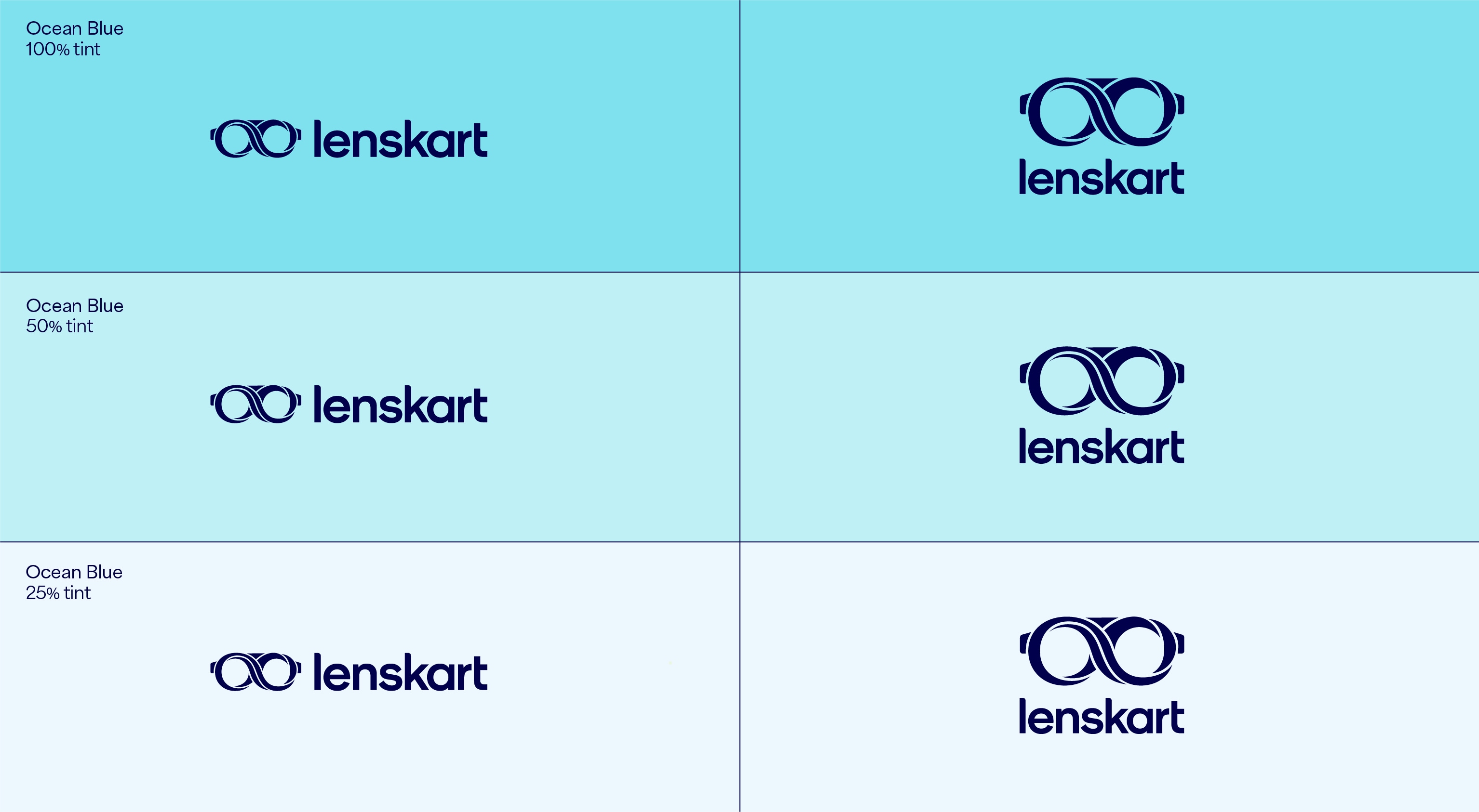 Our leading background colour is See Green in both 100%, 50% and 25%, and Dark Blue is used for our primary lockups. These colours are used to bring awareness to the brand, so a customer’s first interaction of Lenskart should be with these colours. That means we lead with See Green and Dark Blue on applications such as billboards, outer store signage, the loading screen for the app, and the landing of our website. The other background colours are used with the Dark Blue logo further into the experience once the customer has had that first interaction of the brand with the See Green.