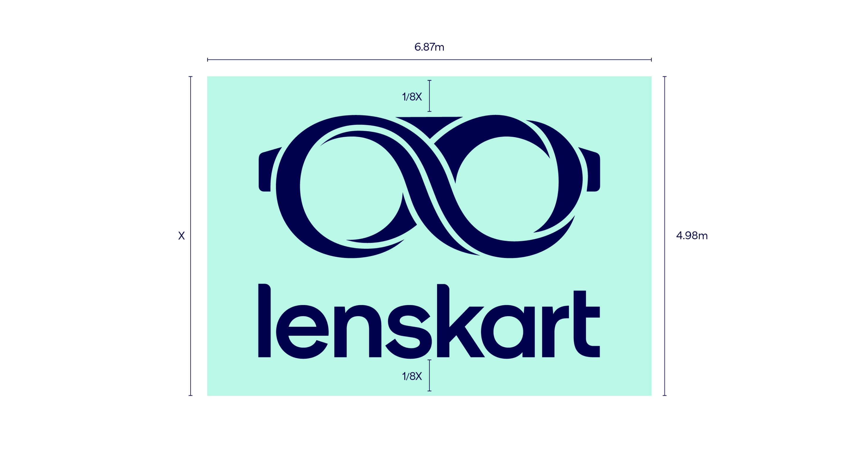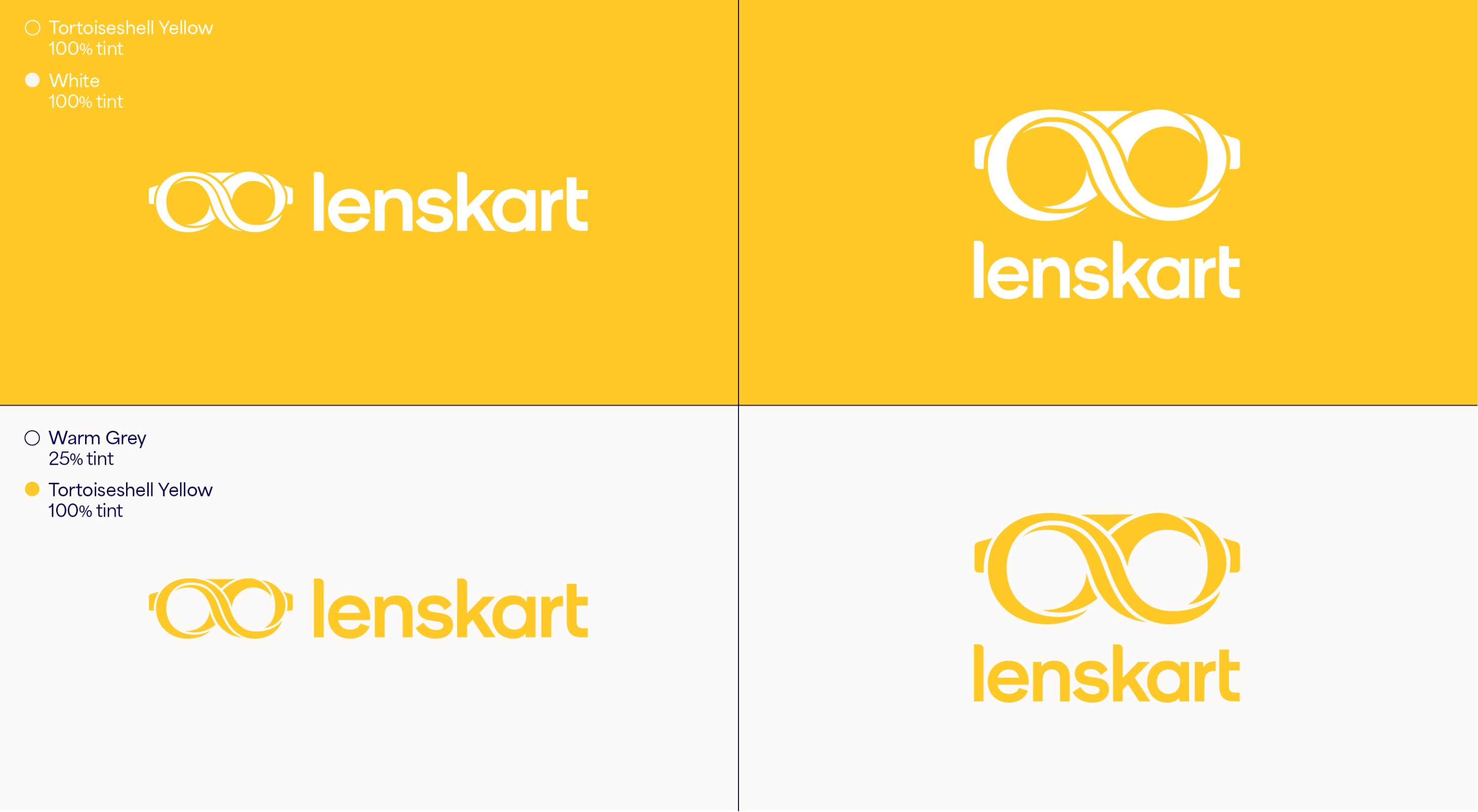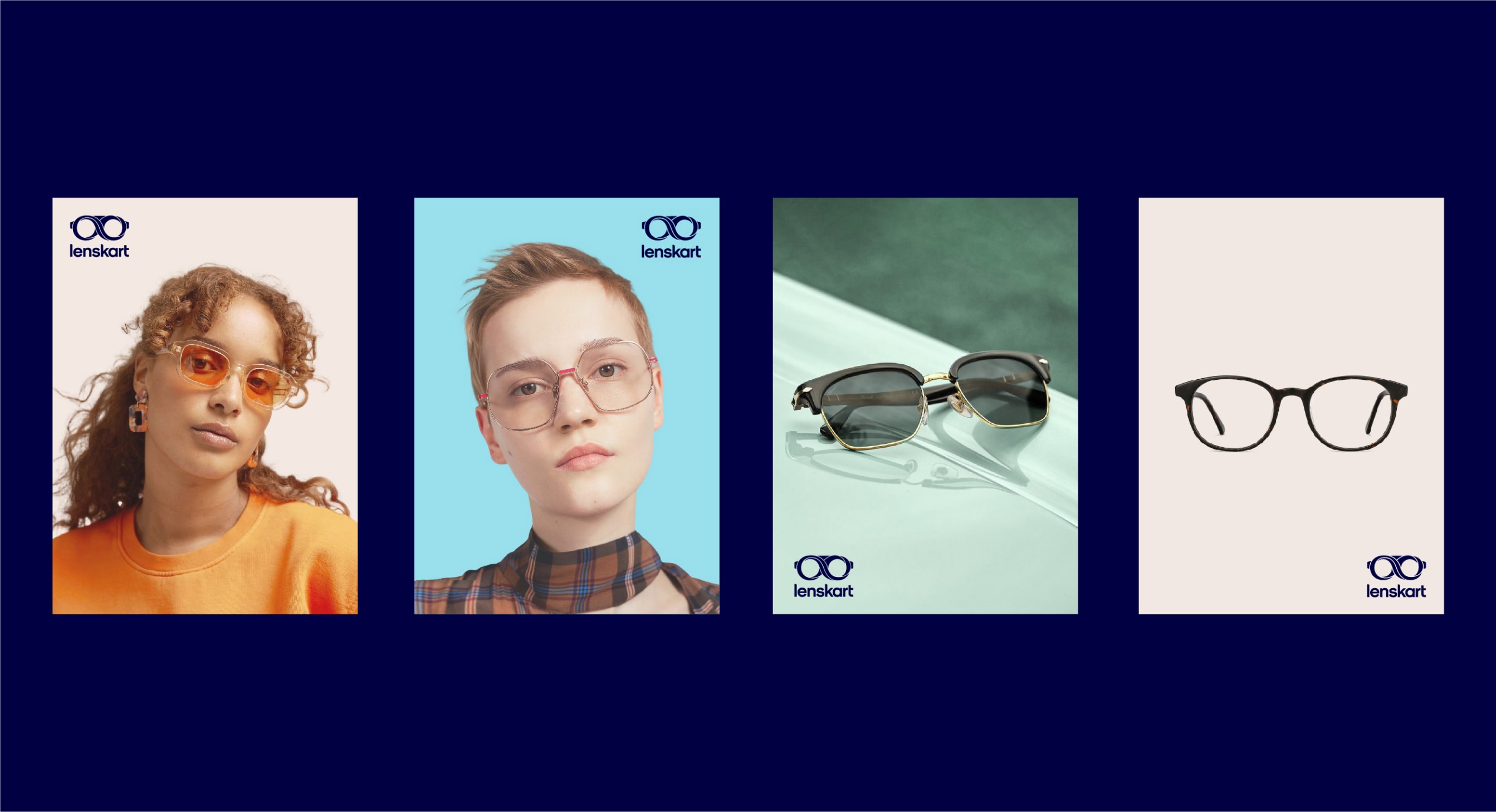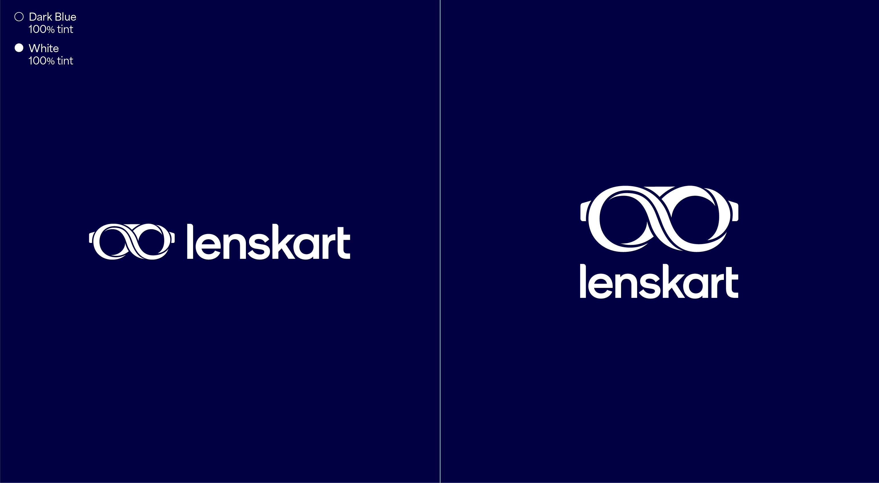 Our leading background colour is See Green in both 100%, 50% and 25%, and Dark Blue is used for our primary lockups. These colours are used to bring awareness to the brand, so a customer’s first interaction of Lenskart should be with these colours. That means we lead with See Green and Dark Blue on applications such as billboards, outer store signage, the loading screen for the app, and the landing of our website. The other background colours are used with the Dark Blue logo further into the experience once the customer has had that first interaction of the brand with the See Green.