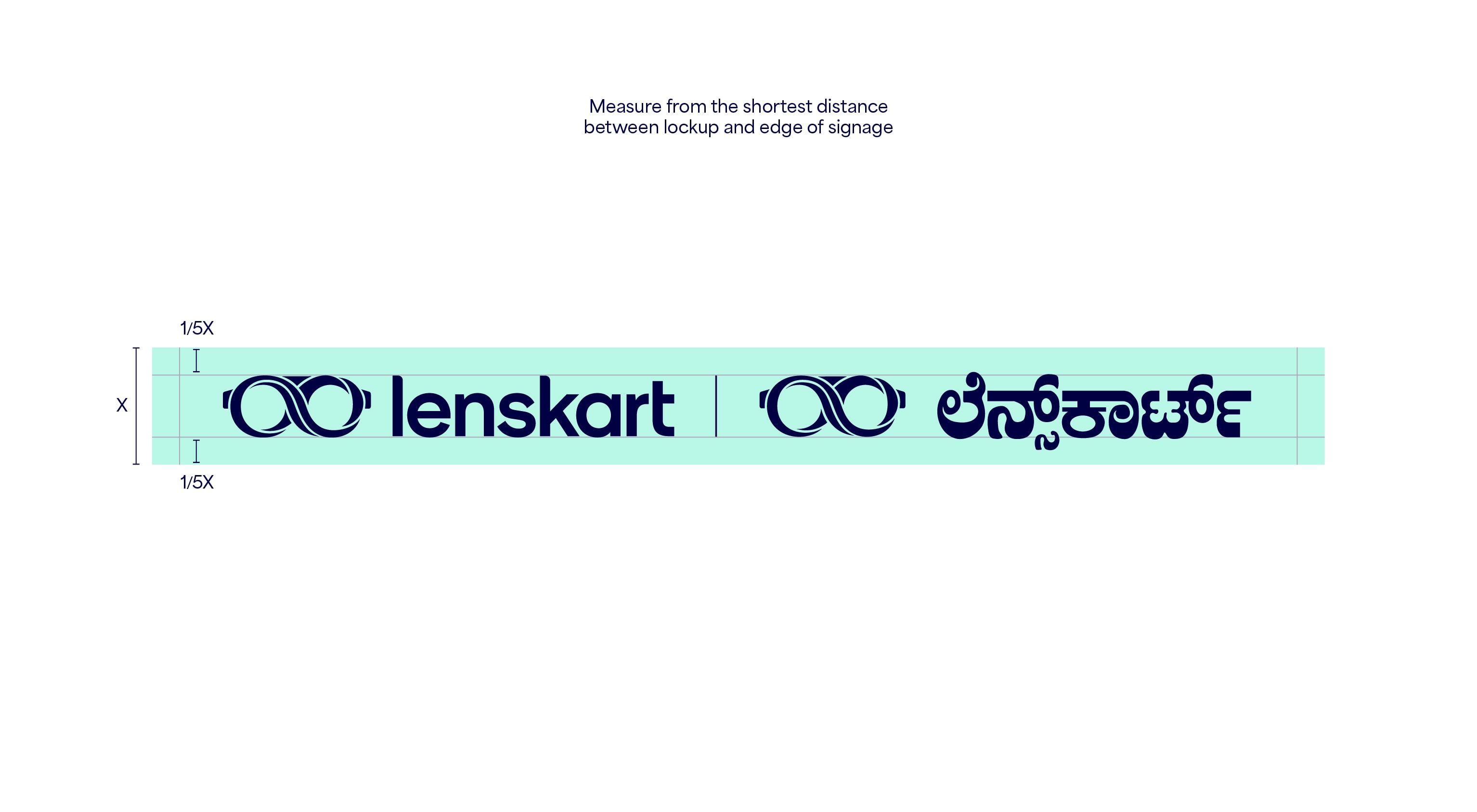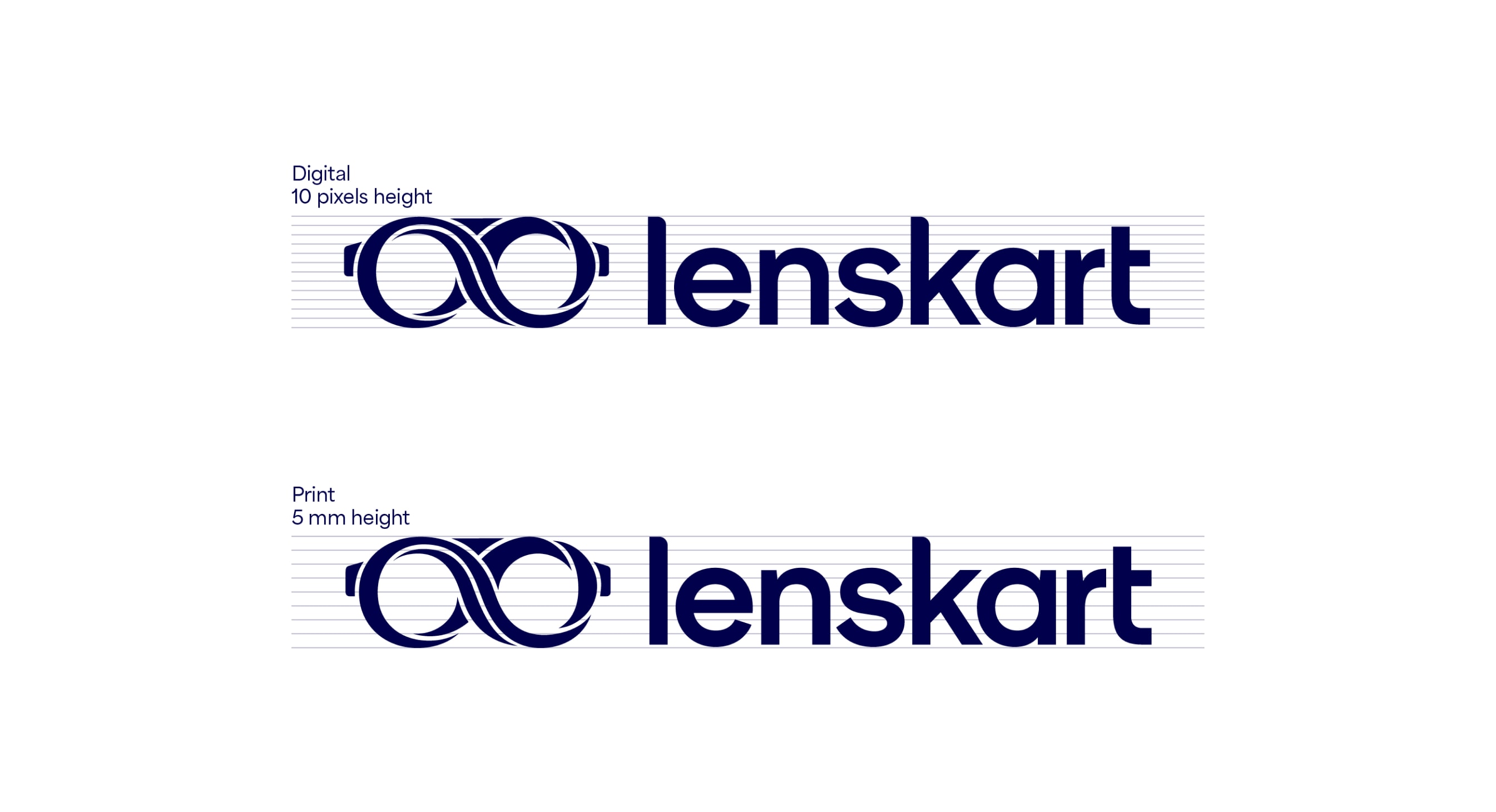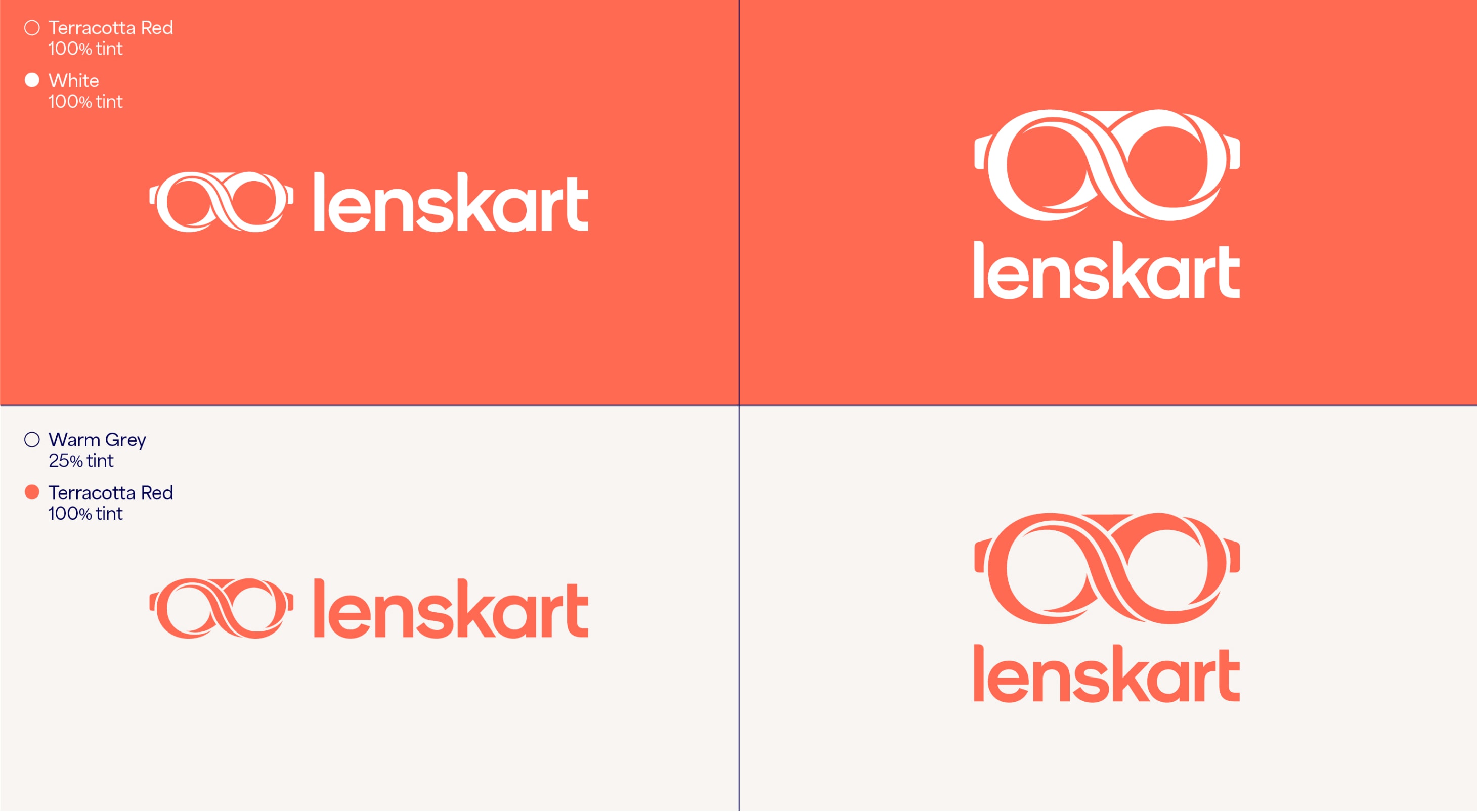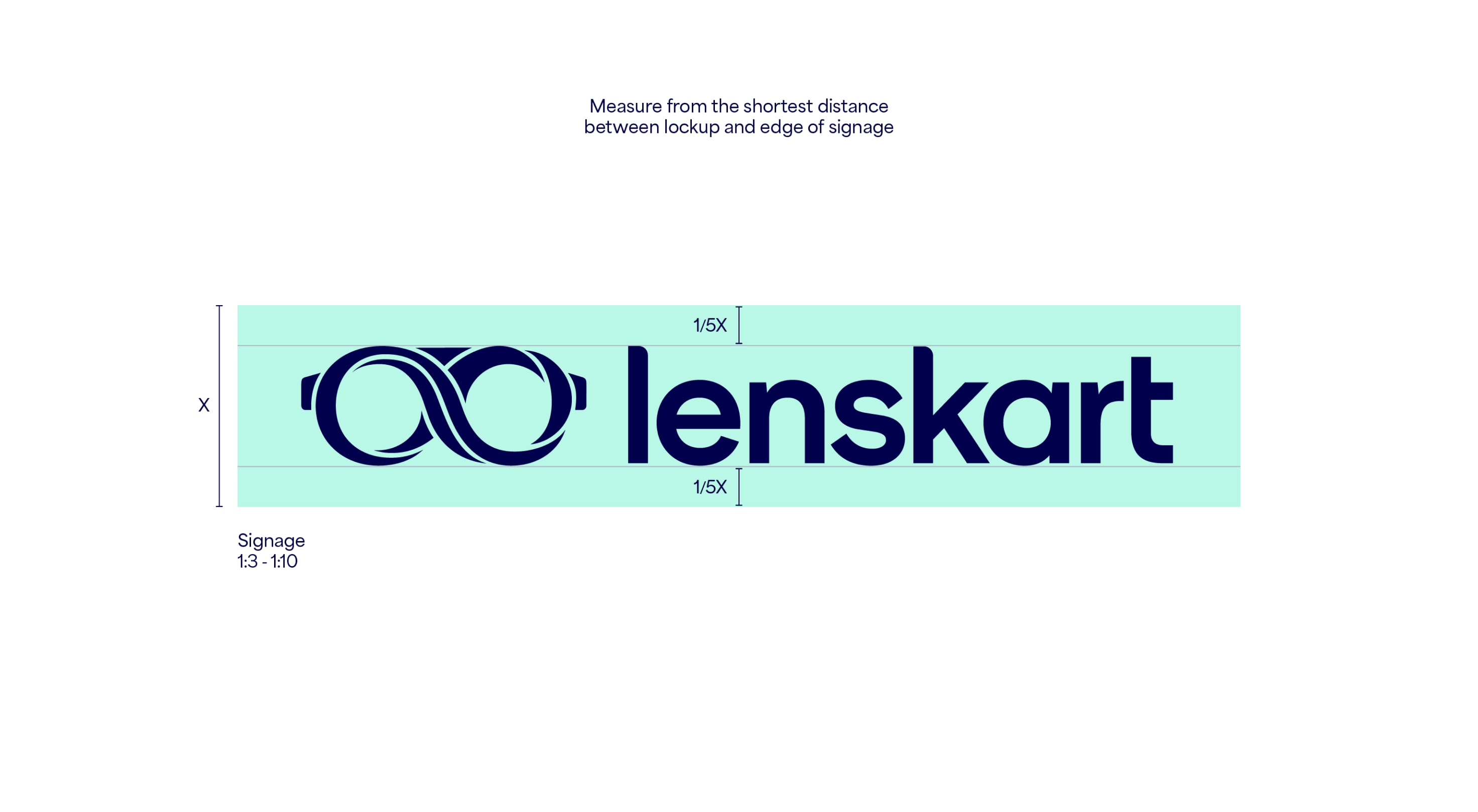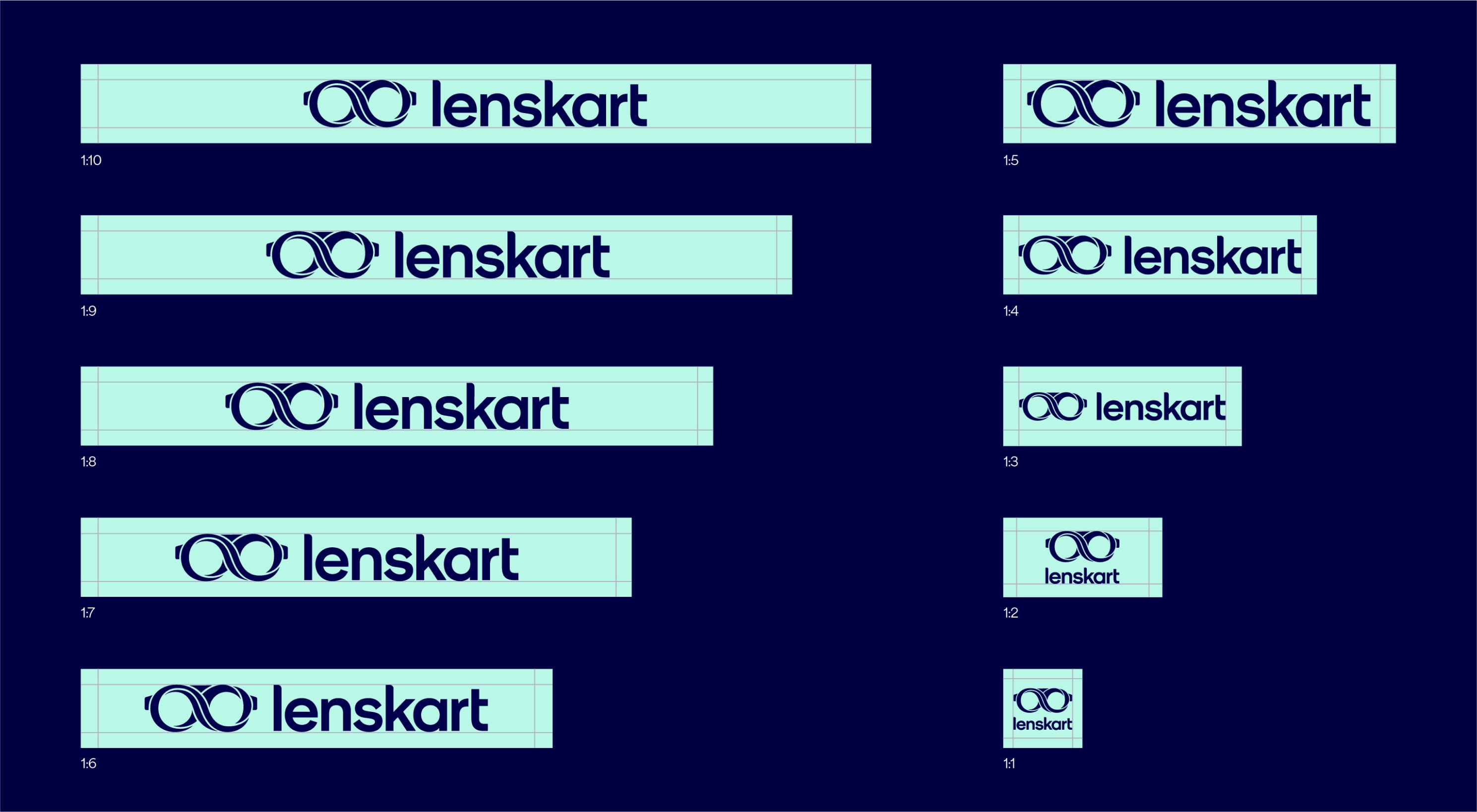 Our leading background colour is See Green in both 100%, 50% and 25%, and Dark Blue is used for our primary lockups. These colours are used to bring awareness to the brand, so a customer’s first interaction of Lenskart should be with these colours. That means we lead with See Green and Dark Blue on applications such as billboards, outer store signage, the loading screen for the app, and the landing of our website. The other background colours are used with the Dark Blue logo further into the experience once the customer has had that first interaction of the brand with the See Green.