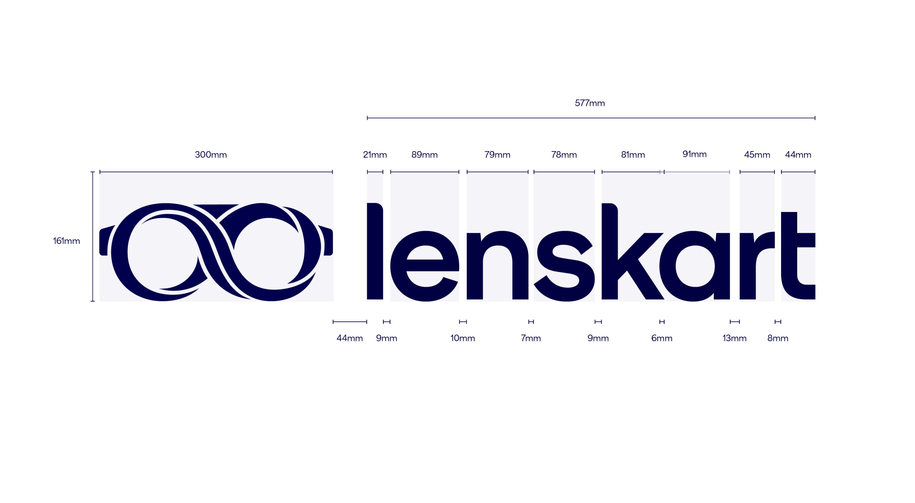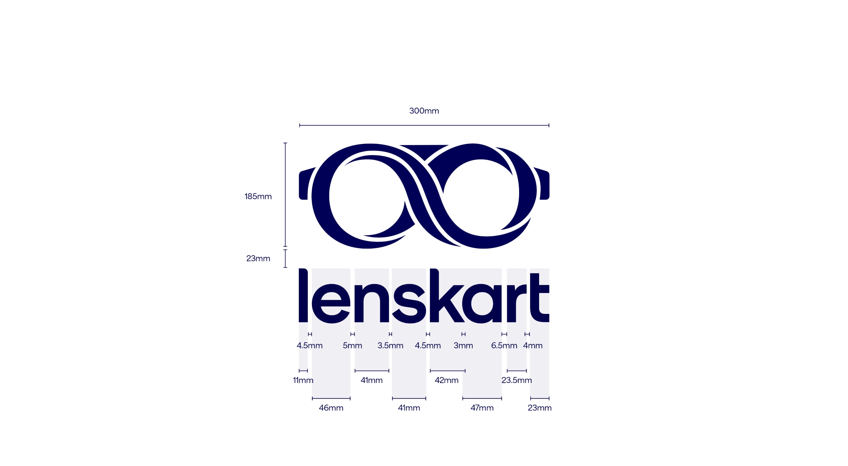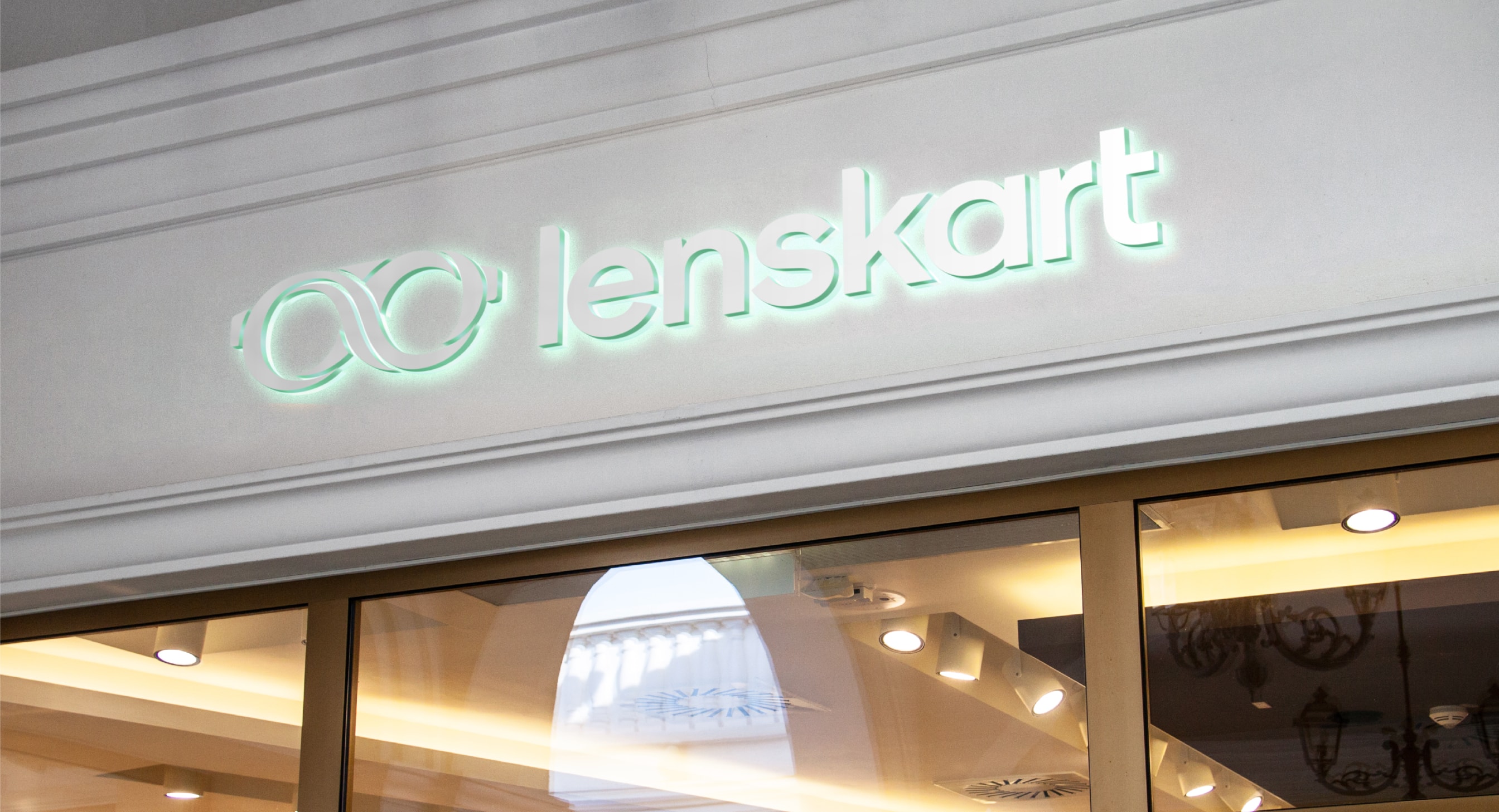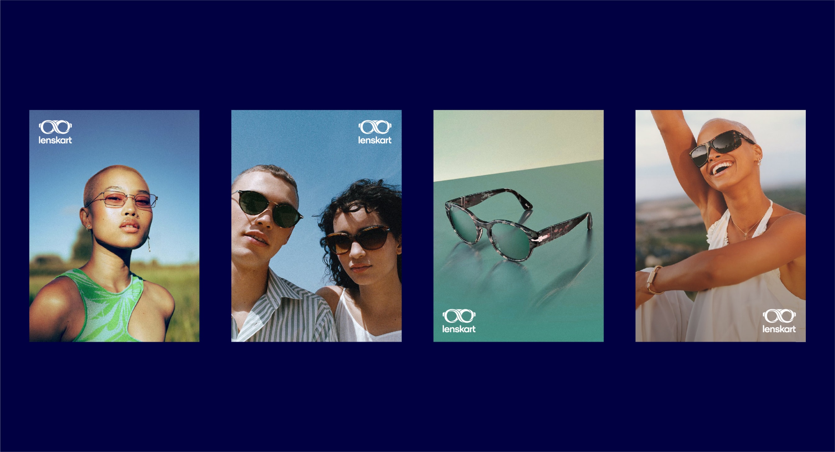 Our leading background colour is See Green in both 100%, 50% and 25%, and Dark Blue is used for our primary lockups. These colours are used to bring awareness to the brand, so a customer’s first interaction of Lenskart should be with these colours. That means we lead with See Green and Dark Blue on applications such as billboards, outer store signage, the loading screen for the app, and the landing of our website. The other background colours are used with the Dark Blue logo further into the experience once the customer has had that first interaction of the brand with the See Green.