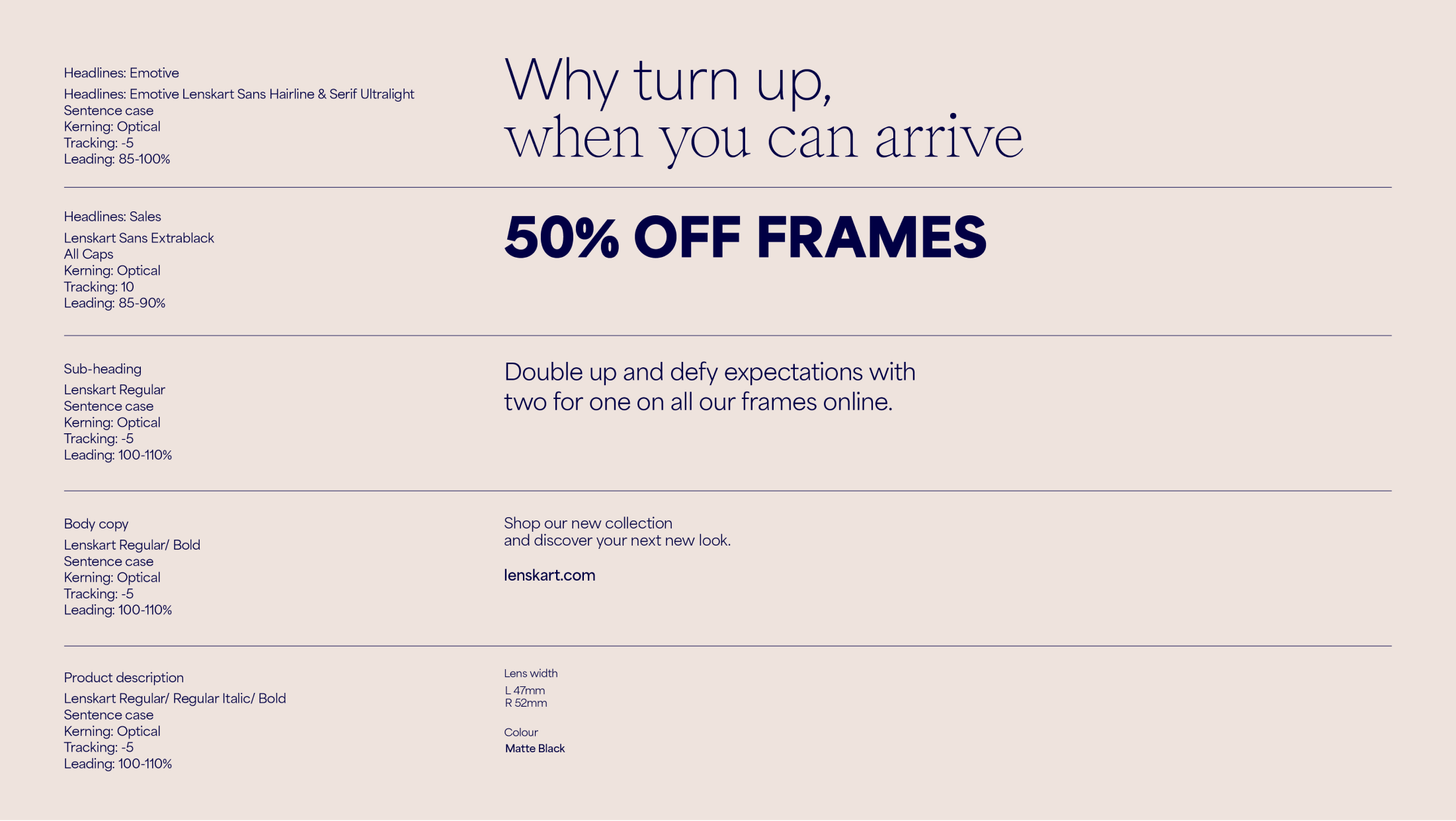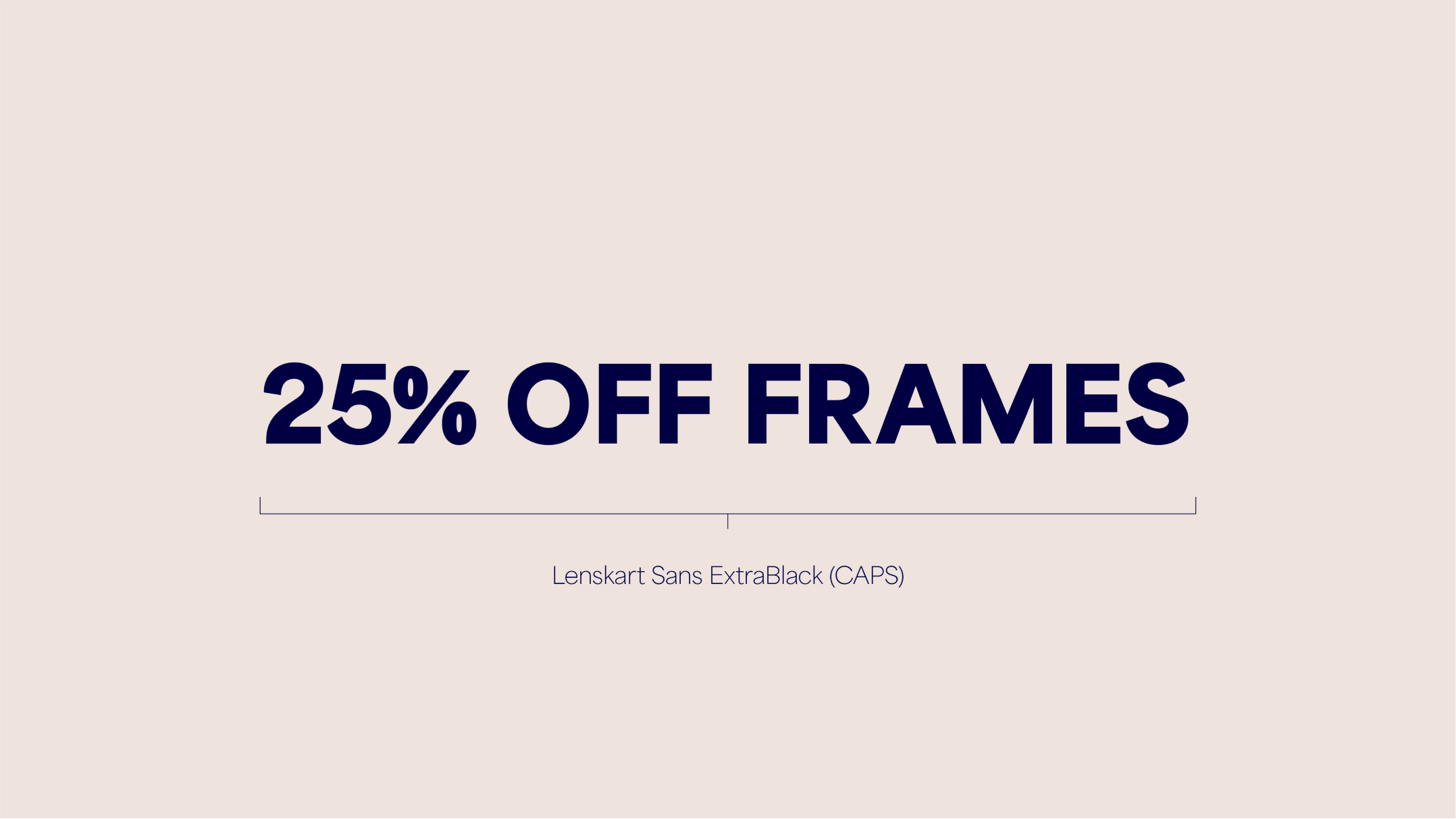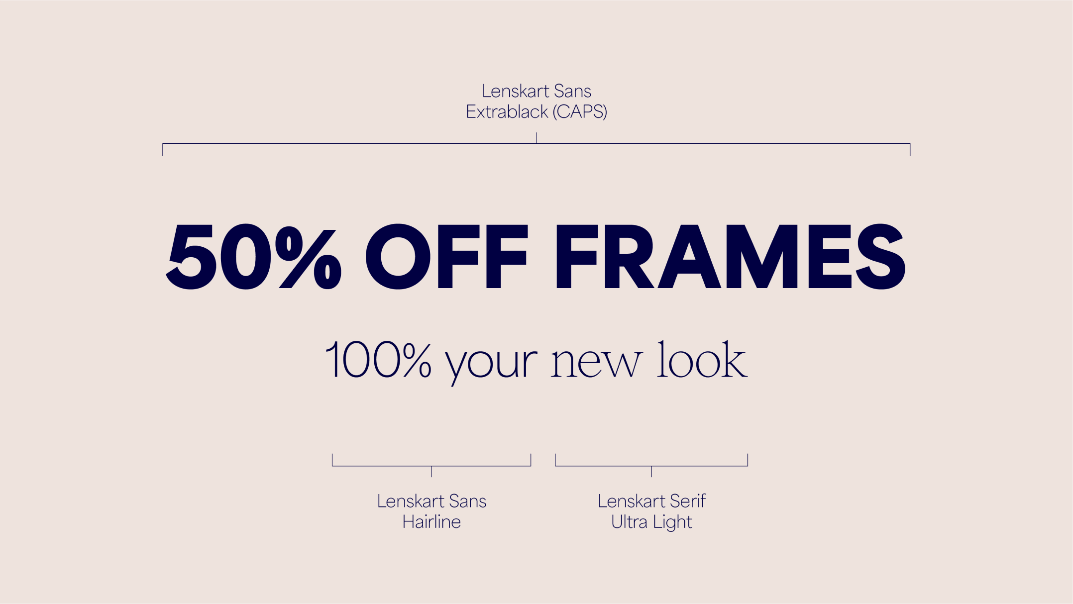 Lenskart Sans is our functional typeface. The lighter weights can be used for small and informative copy, and the bolder weights can be used for louder attention-grabbing comms such as Sales ads.