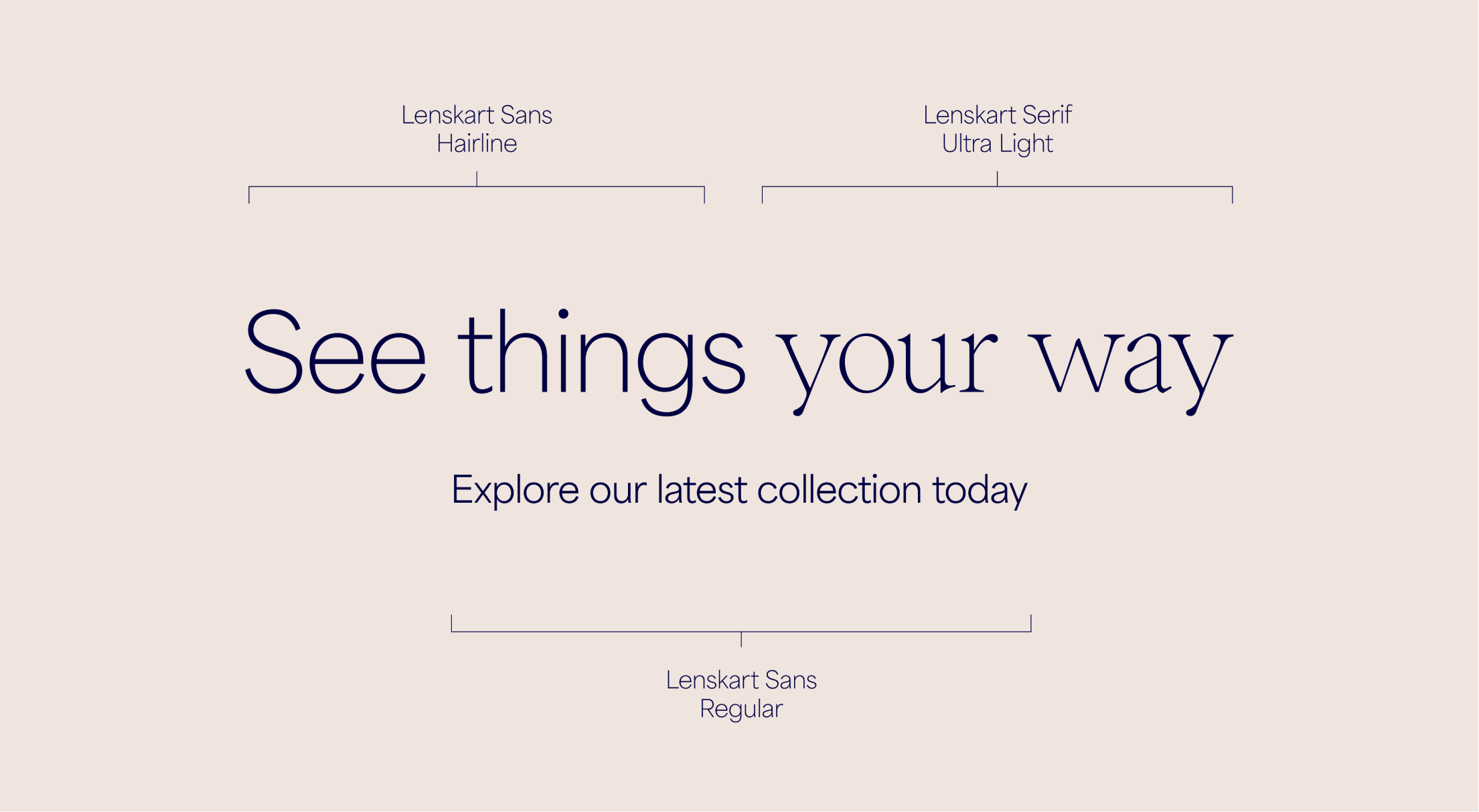 Lenskart Serif is our emotional typeface, with characterful, warm serifs and rounded forms. It brings a touch of warmth to our headlines.